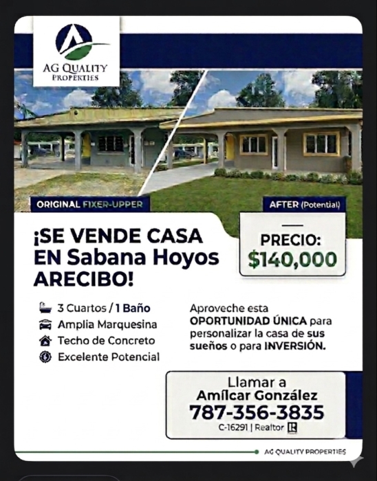 FIXER UPPER. Se vende propiedad en Sábana Hoyos Arecibo, 3 habitaciones, 1 baño, balcon, marquesina y 401 m2. Arregla a tu gusto. Venta AS/IS. Puede cualificar préstamo Rural con reparaciones con Bono de Vivienda. Para mas información y cita. favor de comunicarse con Amílcar González al 787-356-3835. Visite:
